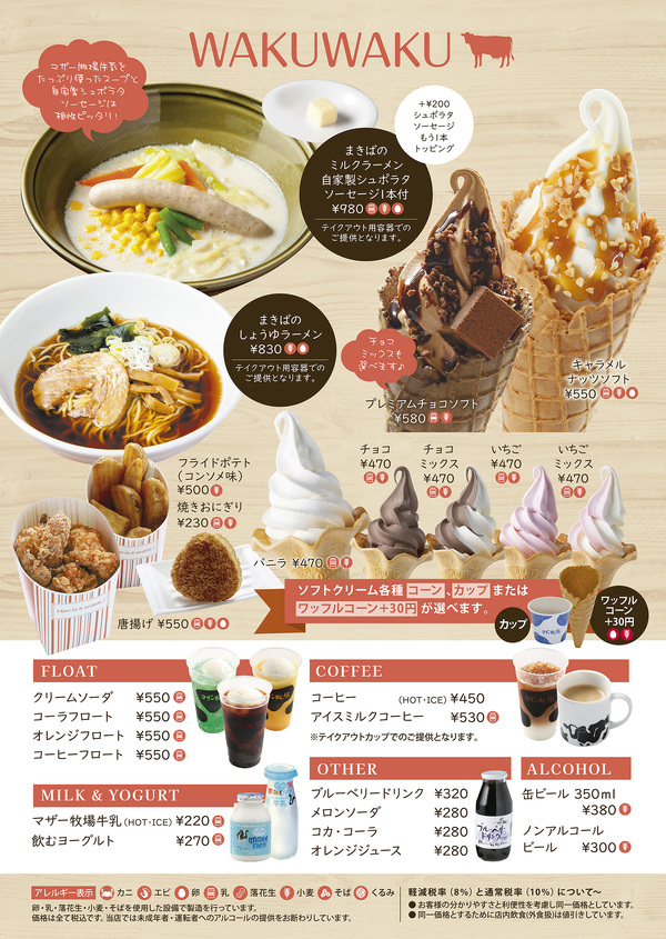 ソフトクリーム・パフェ / ドリンク / ラーメン / 軽食(ハッシュドポテト、焼おにぎり、唐揚げ) ※営業状況や天候等により変更となる場合がございます。 |